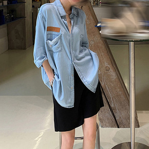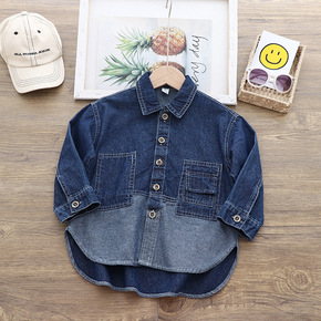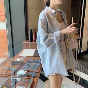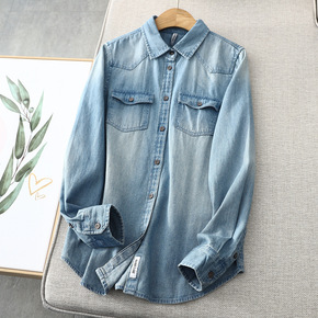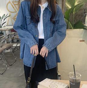 韩版宽松翻领纽扣中长款长袖牛仔衬衫外套女秋季学生显...