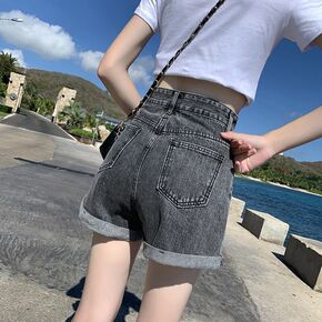 牛仔短裤女夏高腰显瘦百搭新款双排扣卷边女士短裤子学...