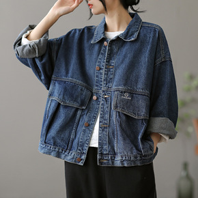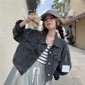 春秋港味落肩贴标设计感牛仔外套女翻领短款上衣潮牌i...
