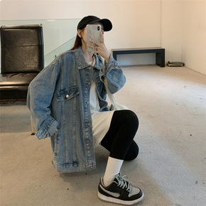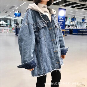 春装新款原宿牛仔外套女学生百搭韩版中长款连帽宽松B...