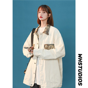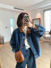 秋季新款咖撞色小众复古水洗宽松休闲长袖牛仔外套2色...