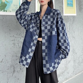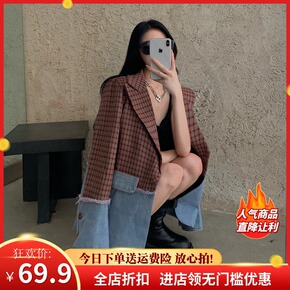 Fu古千鸟格牛仔外套女韩版oversize通勤洋气...
