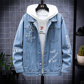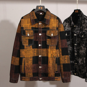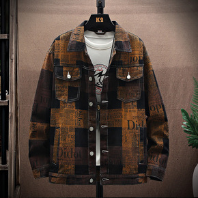 大码男装秋季新款印花牛仔夹克宽松加肥加大男装潮款外...