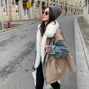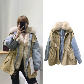 实拍牛仔拼接可脱卸内胆派克服女冬季2020年新款加...