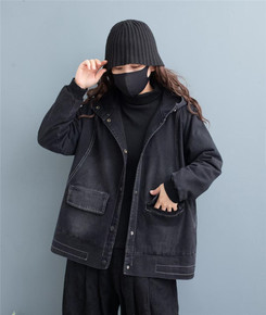 瑟庄秋冬复古加厚夹棉连帽牛仔外套女宽松大码口袋拼接...