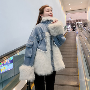 实拍现货2021冬季新款牛仔拼接皮外套棉衣仿毛宽松...