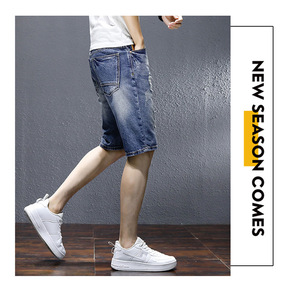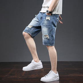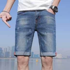 新款夏季潮流男士韩版中裤弹力宽松破洞牛仔短裤五分裤...