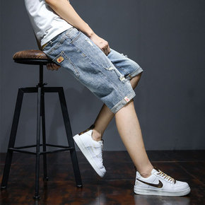 春夏新款休闲时尚高端男士五分牛仔裤破洞短裤男薄款五...