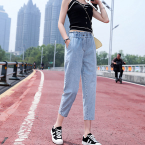 松紧腰刺绣牛仔裤女2021春装新款韩版宽松显瘦哈伦...