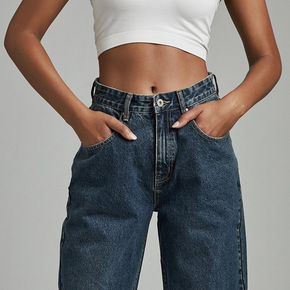 深蓝色卷边直筒牛仔裤女新款2021秋季宽松高腰显瘦...