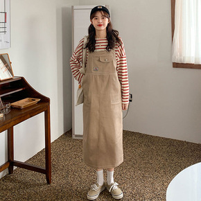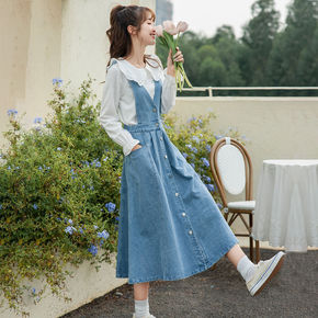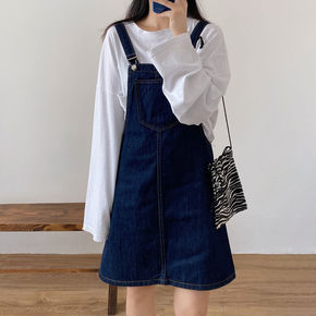春装2020款女韩版复古宽松牛仔背带裙学院风过膝中...