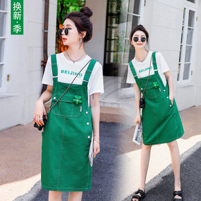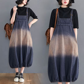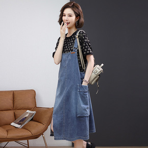 春夏新款个性撞色牛仔背带裙女大码宽松连衣裙百搭显瘦...