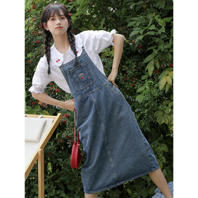 日系复古樱桃刺绣牛仔背带裙背心裙A字裙小个子穿搭...