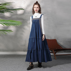 小个子减龄宽松背带牛仔裙2022春夏复古刺绣大码藏...