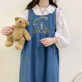日系少女可爱刺绣花朵牛仔背心裙2022宽松背带中长...