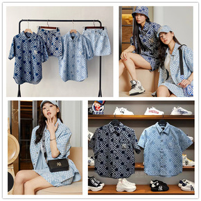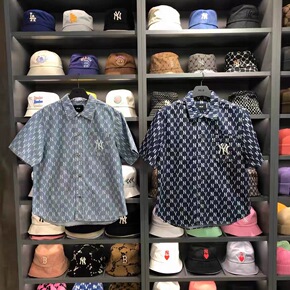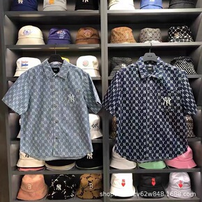 MLB韩国潮牌男女款棋盘格子短袖牛仔衬衫满印ny上...