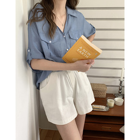 韩国东大门2022夏季新款时尚蓝色西装领双口袋短袖...