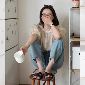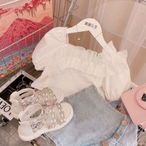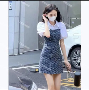 小个子夏季泡泡袖钉珠衬衫收腰显瘦复古印花吊带牛仔连...