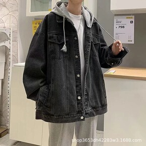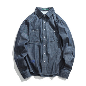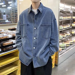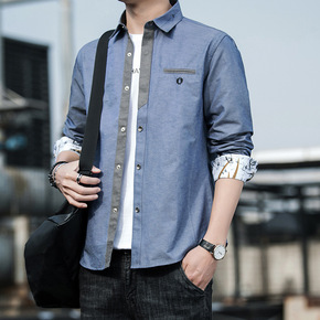 仿牛仔男士春秋季新款潮流长袖衬衫时尚宽松休闲外套工...