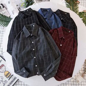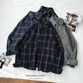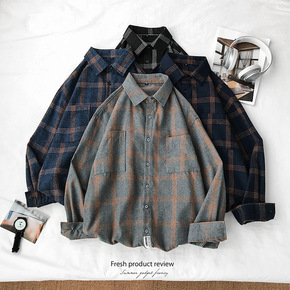 男士高档衬衣春秋新款格子衬衫男港风格子情侣衬衫宽松...