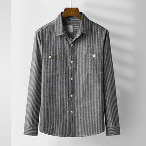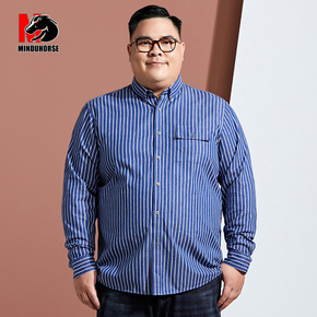 春秋大号肥佬男士口袋竖条纹长袖纯棉衬衫宽松加肥加大...