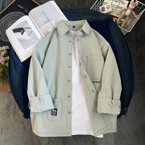 男士春秋季节新款纯色长袖衬衫2021年帅气港风工装...