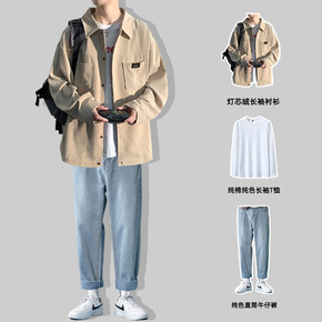 灯芯绒外套男港风日系潮牌春秋痞帅长袖衬衫男装一套搭...