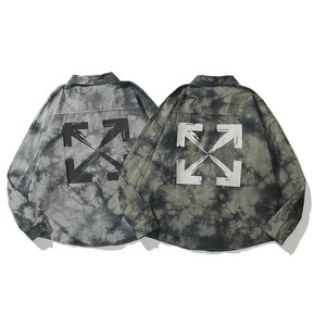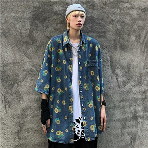 2021夏季复古做旧牛仔衬衫宽松大码满印雏菊水洗短...