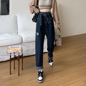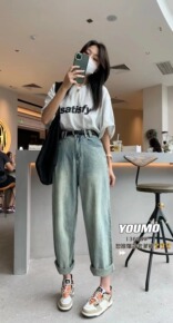 YOUMO有陌牛仔裤女哈伦遮垮2022早秋新款高腰...