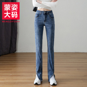 胖mm大码牛仔烟管裤前开叉直筒裤女春秋高个子女生1...