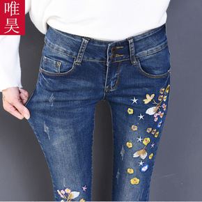 秋冬加绒加厚修身刺绣时尚显瘦牛仔裤女长裤子个性小脚...