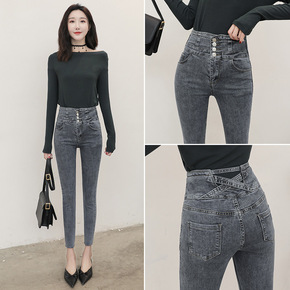 超高腰排扣牛仔裤女2021春新款紧身收腹显瘦小脚裤...