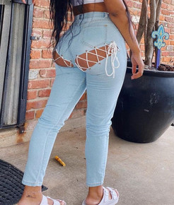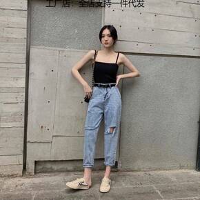 欧美春季新款紧身小脚牛仔裤女Y字手工磨破性感背带长...
