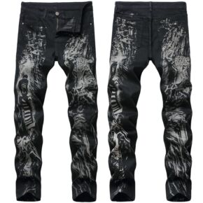 潮牌复古刺绣破洞牛仔裤男士修身弹力小脚裤个性机车乞...