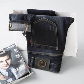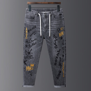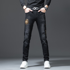 秋冬新款牛仔裤男装烫钻刺绣修身小脚弹力韩版潮流男士...
