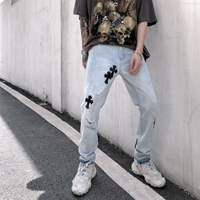 克罗十字架宽松直筒百搭高端休闲水洗大码浅蓝高街牛仔...