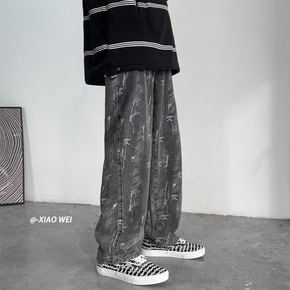 春秋季阔腿牛仔长裤男宽松印花直筒拖地裤ins港风潮...