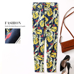 欧洲站高端精品女装春夏旅游度假印花小脚铅笔裤弹力显...