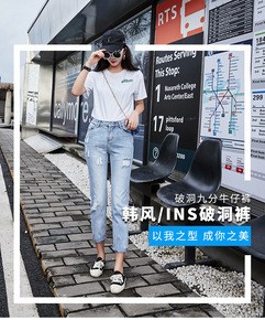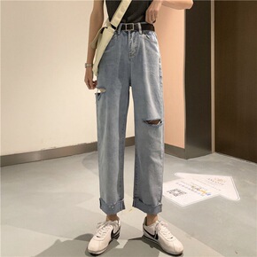 夏季韩版ins复古宽松直筒破洞牛仔裤女高腰显瘦乞丐...