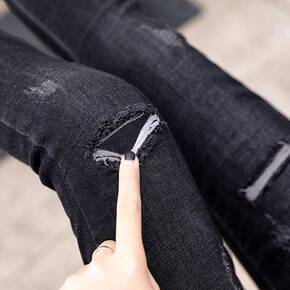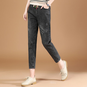 松紧腰洗水黑色牛仔裤女2022年春秋新款字母印花显...