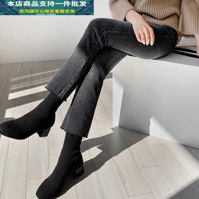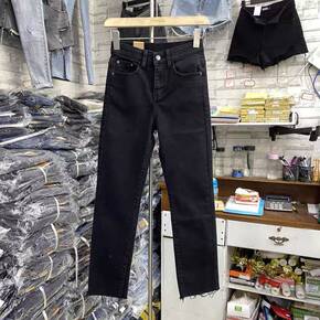 素度爆款显瘦烟管裤女九分直筒裤弹力毛边黑色牛仔裤女...