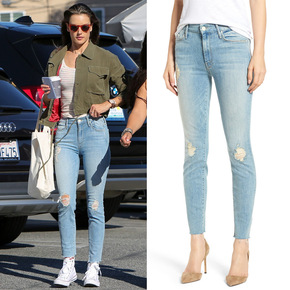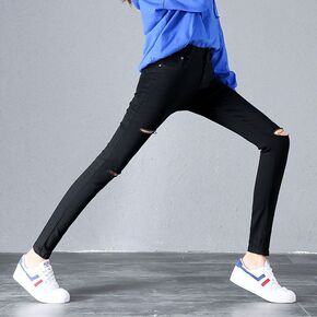 夏季薄款MO浅色水洗破洞小脚裤牛仔裤女毛边弹力修身...