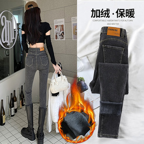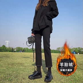 黑色小直筒牛仔裤女加绒加厚高腰弹力修身显瘦外穿九分...