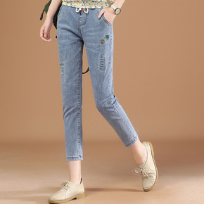 水洗浅色松紧腰女士牛仔裤2022夏装新款卡通刺绣九...