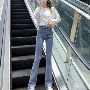 新款微喇牛仔裤女弹力韩版学生喇叭裤高腰显瘦修身直筒...