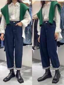 实拍直筒牛仔裤女2021春秋装新款宽松高腰显瘦小个...