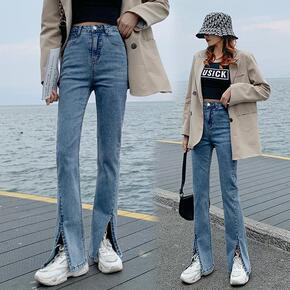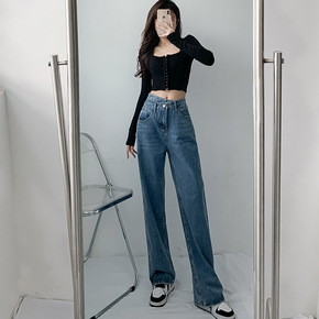 开叉牛仔裤女2021夏季新款韩版宽松高腰垂感显瘦阔...