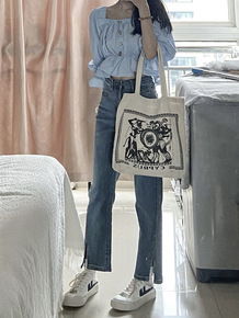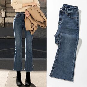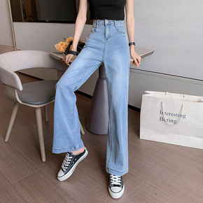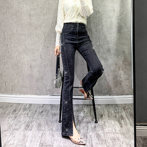烫钻开叉微喇叭牛仔裤女高腰秋季新款直筒阔腿宽松垂感...