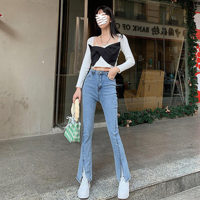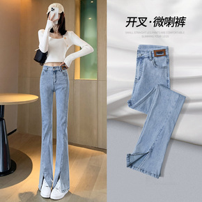 开叉喇叭牛仔裤女春装2022年新款高腰显瘦浅色拖地...
