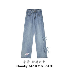 大码胖mm别致蝴蝶结牛仔裤女秋季新款宽松ins显瘦...